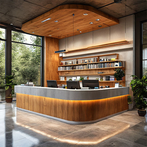 Мебель для ресепшена: стойки ресепшена и регистрационные столы, кресла и диваны для зоны ресепшен, шкафы и полки для хранения документов и оборудования
